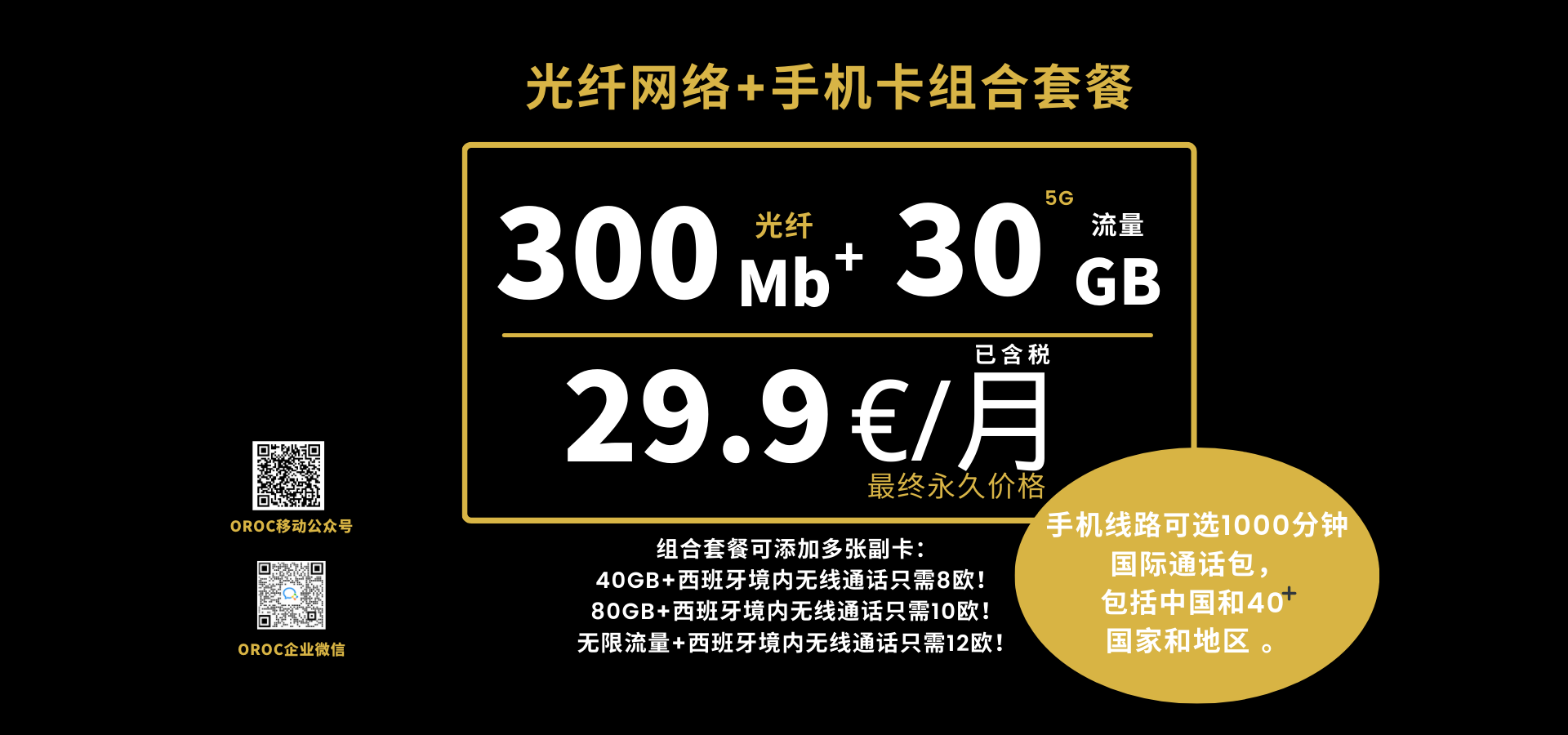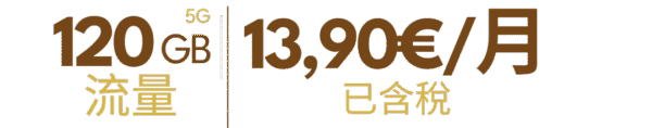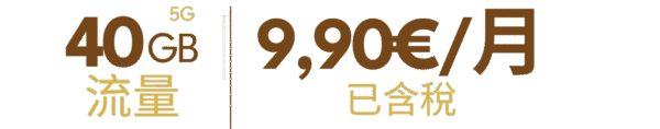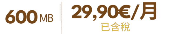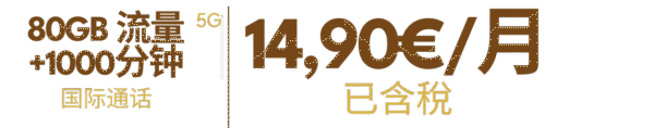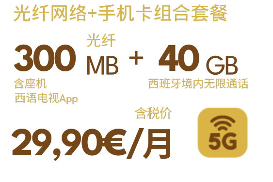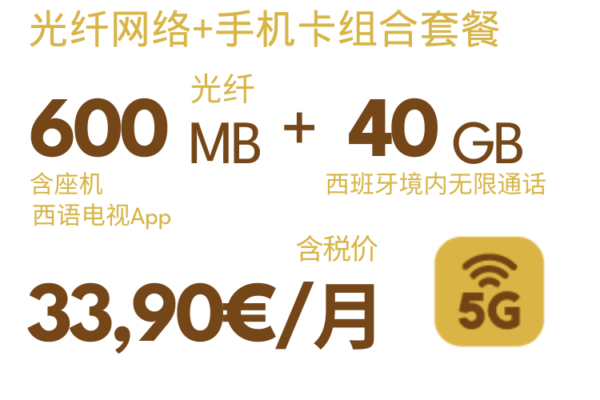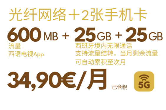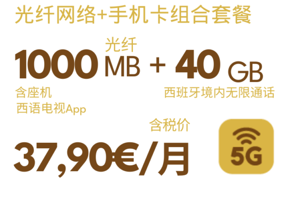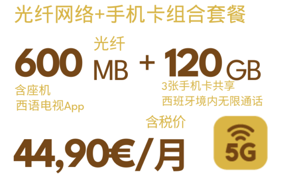 组合套餐可添加副卡(最多添加4张副卡),40GB8欧(已含税),80GB10欧(已含税),无限流量12欧(已含税),西班牙境内无限通话。